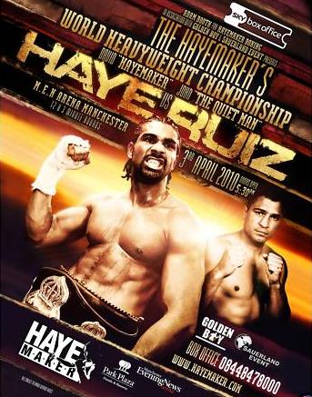 Haye realizará su primera defensa después de proclamarse campeón de la AMB hace uno meses imponiéndose al gigante ruso Nicolay Valuev a los puntos, el británico espera realizar un buen combate ante su público ya que Ruiz casi es un boxeador de la misma envergadura y no tendra los problemas que tuvo para pelear con el gigante Valuev debido a su gran tamaño.