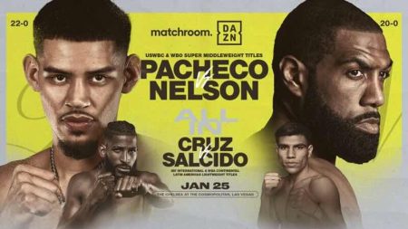 En un choque de alto relieve mundial, Cóceres (32-5-1, 18 KOs), actual campeón sudamericano mediopesado, ex campeón latino superwelter de la Federación Internacional de Boxeo (FIB), latino CMB y OMB, y fedebol de la Asociación Mundial de Boxeo (AMB) de los medianos, además de argentino supermediano y fedebol AMB, buscará hacer pesar su experiencia que lo llevó a disputar el título mundial supermediano OMB cayendo ante el inglés Billy Joe Saunders en once asaltos -estando en ventaja en una de las tarjetas- en 2019, y tras destacadas presentaciones exigiendo como visitante a rivales de primer orden como el estadounidense Edgar Berlanga, el canadiense Erik Bazinyan, el kazajo Meiirim Nursultanov, llega del pasado 19 de mayo destruir al marplatense Leonel Ávila en dos rounds para obtener el cetro sudamericano. Enfrente estará el californiano Pacheco (19-0, 16 KOs), Nº 2 del ranking mundial supermediano OMB, Nº 5 FIB, Nº 6 CMB y Nº 8 AMB, considerado de las máximas estrellas a futuro de la disciplina, quien con su llamativa altura de 1,93 m. -y su alcance de más de 2 metros- ha despachado a cuanto rival tuvo enfrente, e intentará defender por tercera ocasión su corona estadounidense CMB que conquistó el 17 de septiembre al acabar con el puertorriqueño Enrique Collazo en cinco capítulos, que retuvo sobre el mexicano Ricardo Luna, y por segunda la internacional OMB con el que se alzó el 11 de marzo sobre el inglés Jack Cullen en cuatro episodios, y viene del 7 de julio liquidar al mexicano Manuel Gallegos por nocaut técnico en el cuarto round en defensa de sus fajas.
